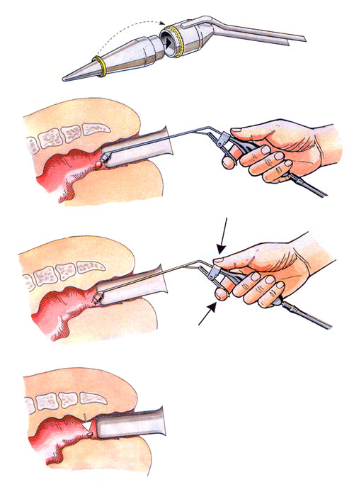 После купирования острого процесса (7-14 дней) удаляются внутренние геморроидальные узлы (в зависимости от степени: при первой, второй и большинство случаев с третьей степенью – нехирургическое лечение (склерозирование, лигирование, лигирование в сочетании со склерозированием), при ряде случаев с третьей степенью и четвертой степенью мы направляем на оперативное лечение в стационар, а в будущем этих пациентов планируем оперировать амбулаторно с помощью лазерных технологий.